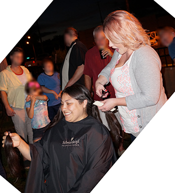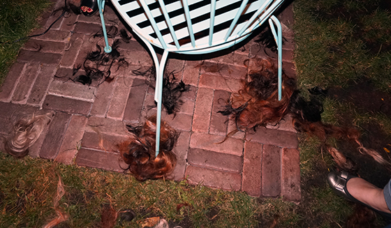 Friends, family members, and partners joined in as each participant took a turn adding their locks to the pile on the ground. Reverse mohawks, mullets, and moustaches made of ponytails were just part of the festivities.
